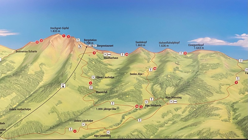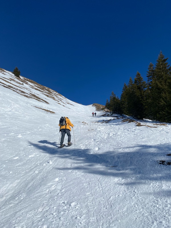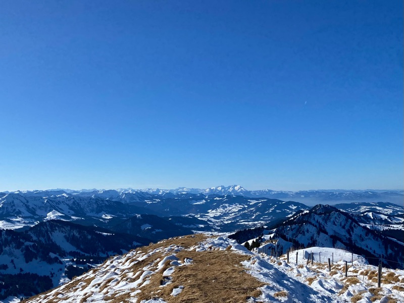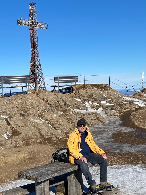 Unser Wohlfühl - Wochenende dauerte nicht nur drei sondern fünf Tage. Da hat man die Möglichkeit, so einige Gipfel zu ergondeln. Am dritten Tag schwebten wir mit der Hochgratbahn auf 1833 m. Von dort kletterten wir mit unsern Schneeschuhen steil aufwärts zum Gipfel. Das war dann aber auch genug. Ich war erschöpft und machte mir grosse Sorgen, wie wir da wieder runter kommen sollten. Das trübte meine Freude über die phantastische Aussicht etwas. Zum Glück erwies sich die Wanderung zurück zur Bergstation dann als weniger mühsam. Wir bewegten uns eine gute Weile dem Grat entlang, bis es wieder abwärts ging. Ich überlebte die Strapazen im Gegensatz zu meinen Wanderschuhen. Dort lösten sich die Sohlen. Sie hatten genug, was ich erst beim Abschnallen der Schneeschuhe bemerkte.
